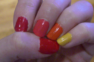 I never did manage to get the stamping done. Kept running out of time here and there. I used the following polishes: Elf Smoking Hot (on thumb), Electric Fuchsia, Flirty Fuchsia, Mango Madness, and Sunflower (on pinkie). I did learn one thing from this, I don't like wearing warm colors on my nails. The yellow was particularly hard to wear.