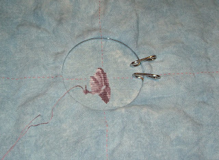I started working on one of the Valentine Trifles by Shepherds Bush this week. I bought most of the stuff for it when I went up to the shop a few weeks ago. I'm using the called for flosses and fabrics and I've already managed to get off a stitch. I stared at that last 'e' for quite a while before deciding I was just going to go with it.