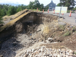 Back to the rainstorm, a section of road near our house washed out and all the debris filled up a business that was down at the bottom of the hill. My sister and I walked down to check it out Sunday after church. There's a woman standing half way up the crater for a sense of scale.