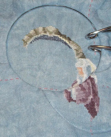 September 29th and I had finished the arch and did a bit of work on the background fill. I'm not sold on the single thread half crosses. I think I might try two strand half crosses to see if I like that coverage better.