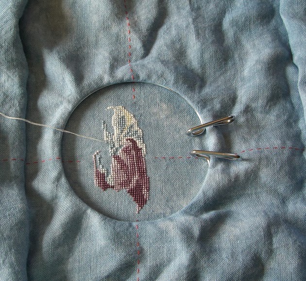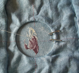 The color is a bit off since the project is on a blue table cloth. The linen is really quite a bit whiter. This one will turn out cute as can be.